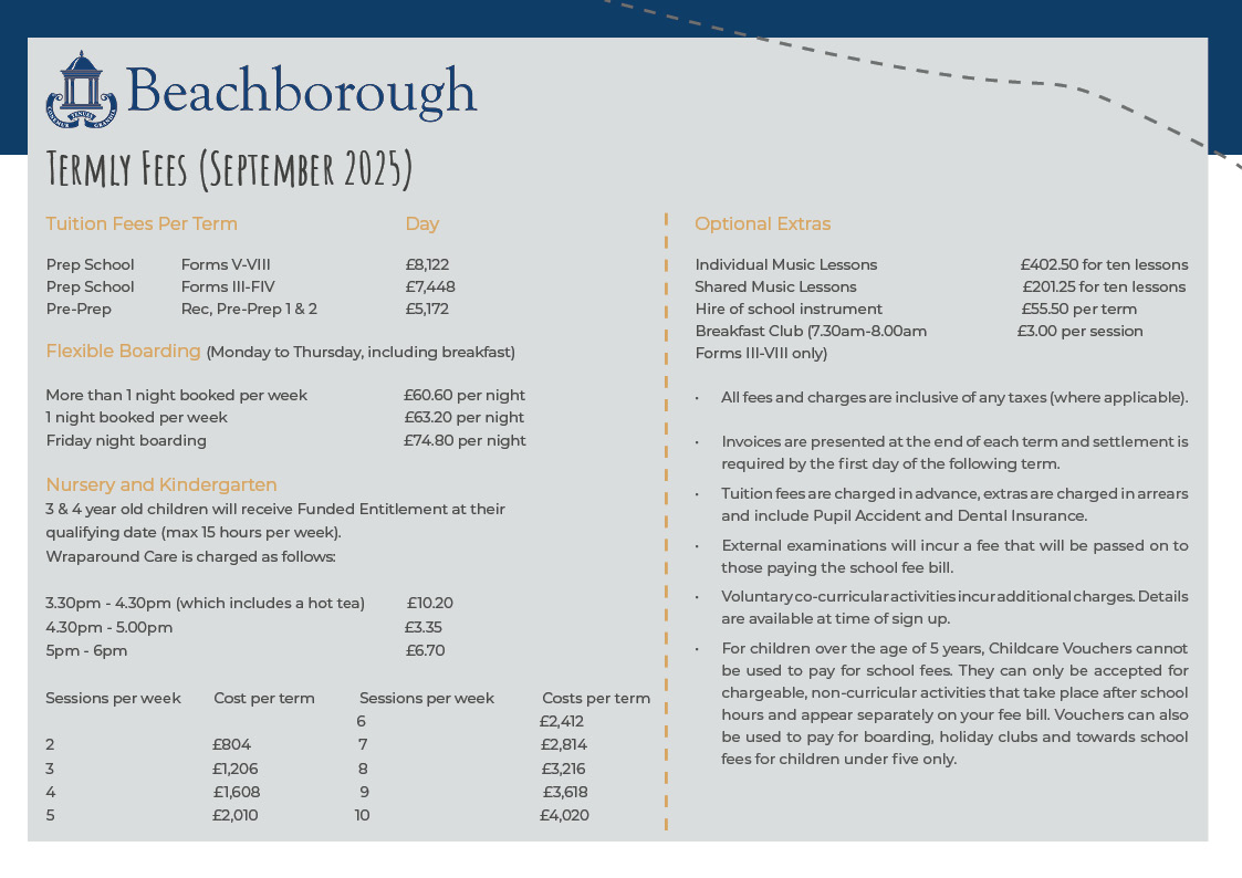 Beachborough Prep works hard to ensure fees represent good value for the outstanding all-round education we provide. We care about being as transparent as possible and for this reason, include everything, apart from optional music lessons, school trips, boarding and our co-curricular activities in our fees. For example, although the Reception day is from 9am until 3.30pm, flexible wrap around care (including tea) is offered at no extra cost from 8am to 6pm, making this excellent value.